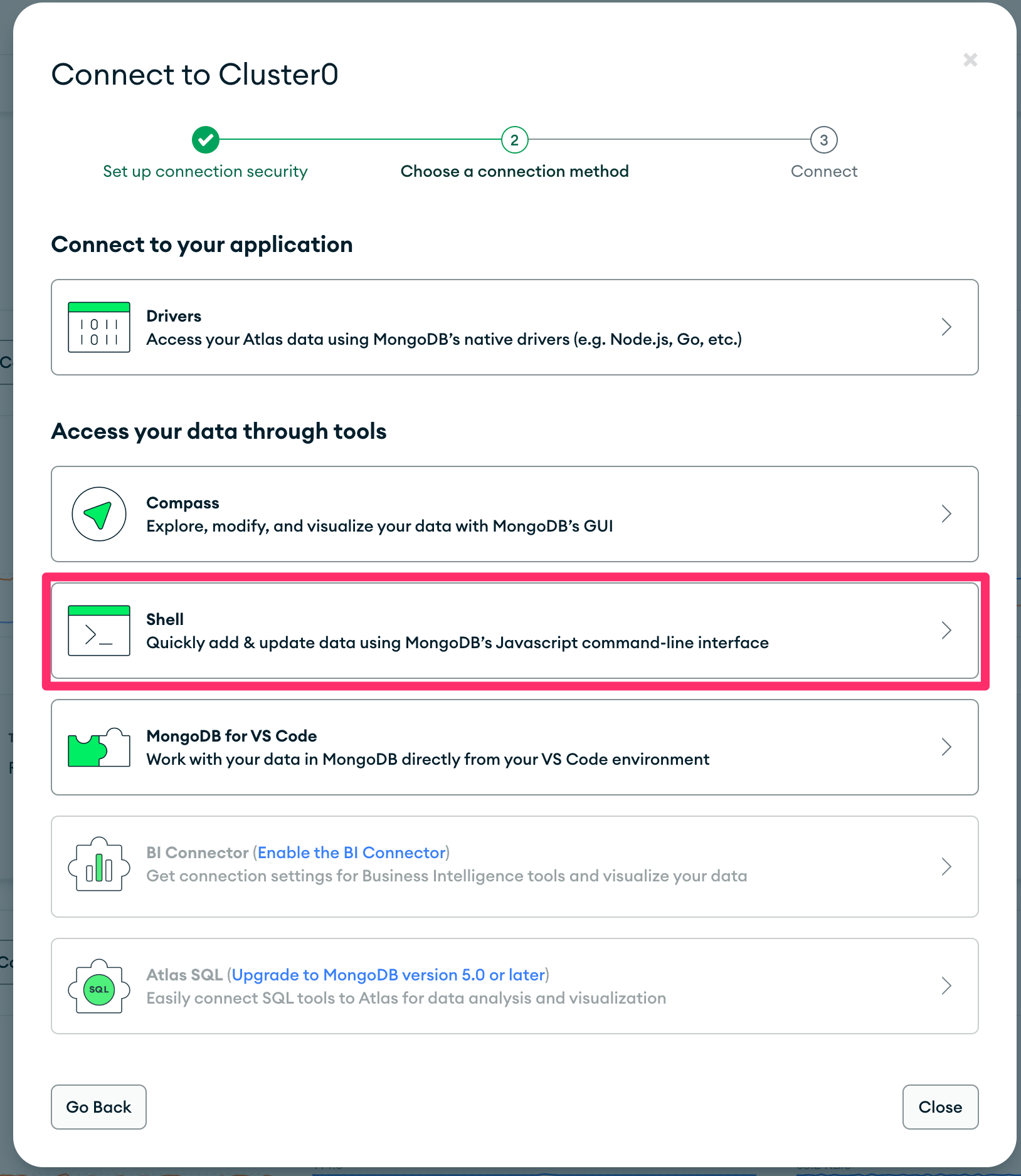 - On the "Connect to <cluster name>" modal dialog, select "Shell" under the "Access your data through tools" section.